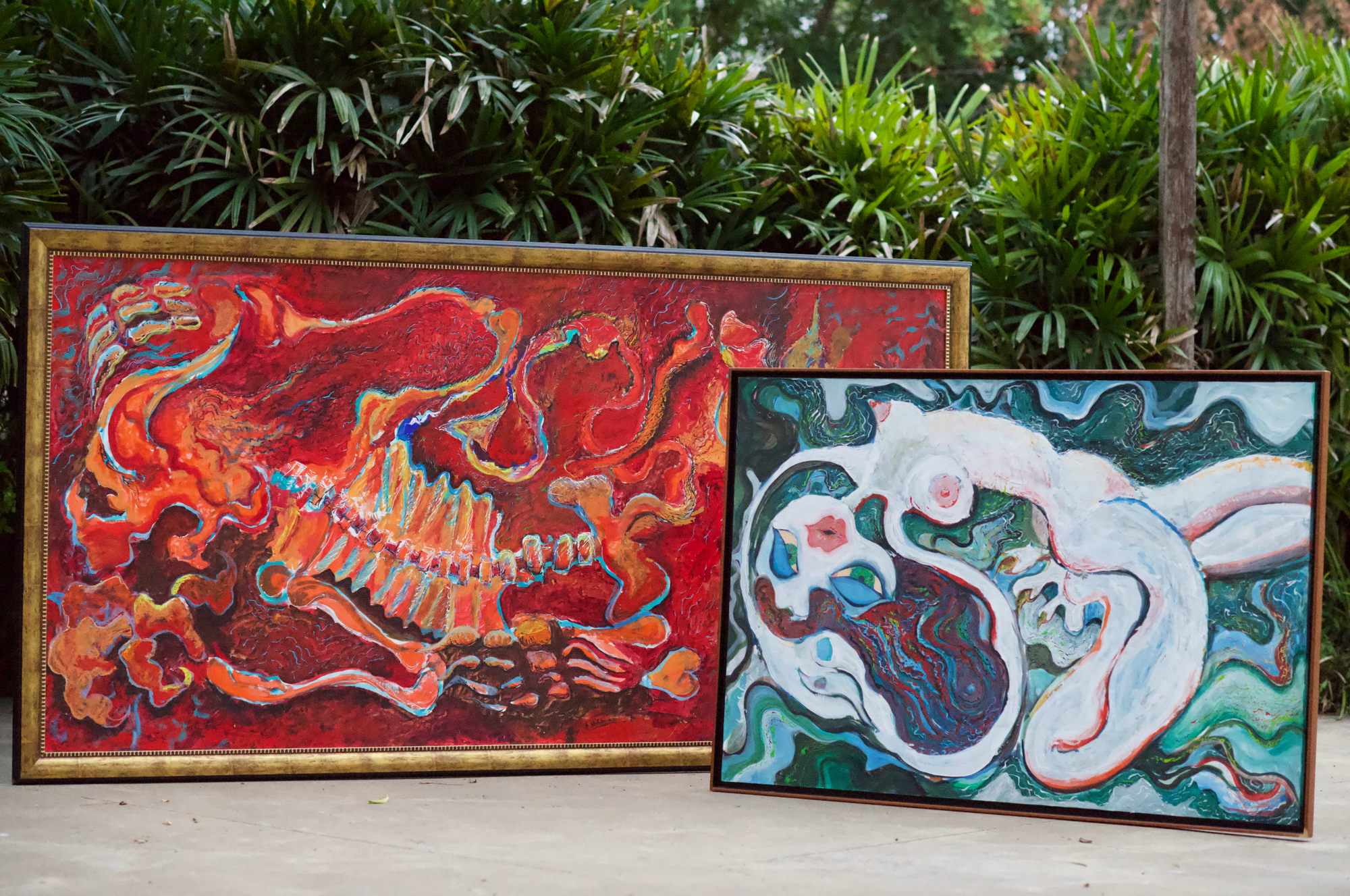For our first collection we collaborated with Mexican painter and architect Hugo Salinas. His abstract and expressive art provided us with the perfect prints. The two paintings we drew inspiration from are “La Lujuria” and “Atame”. One with alluring reds, the other with harmonious blues– beautiful oppositions of one another.